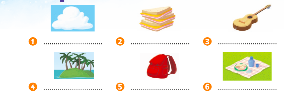(1)  island (2) picnic  (3) sandwiches  (4) rucksack/backpack  (5) cloud (6)  guitar