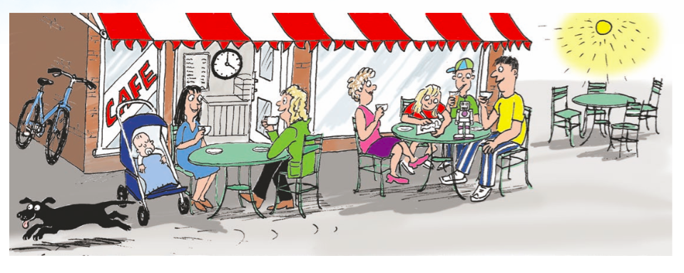 2 The people are sitting around round green tables outside a small café. They’re drinking coffee and juice.