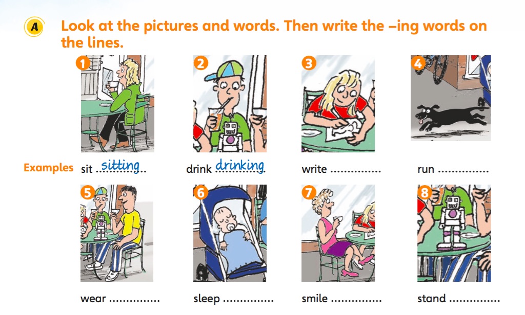 The focus is on the -ing forms of eight verbs. The verbs show the three ‘rules’ of forming -in forms: