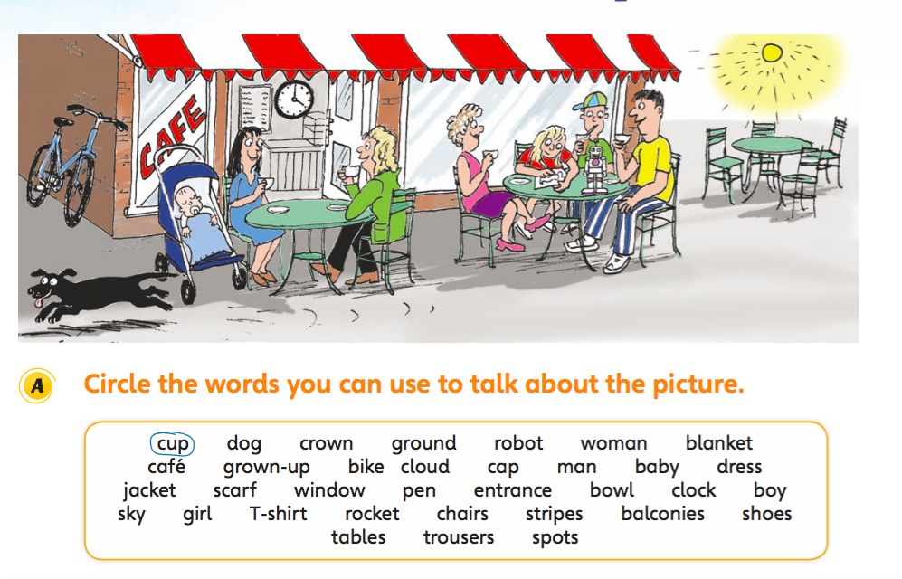 2 Or, why not ask them to add the missing things to the picture? e.g. Put spots on the blanket. Draw a bowl for the dog outside the café. Draw a crown on someone’s head. (Your students can choose where to add these things.)