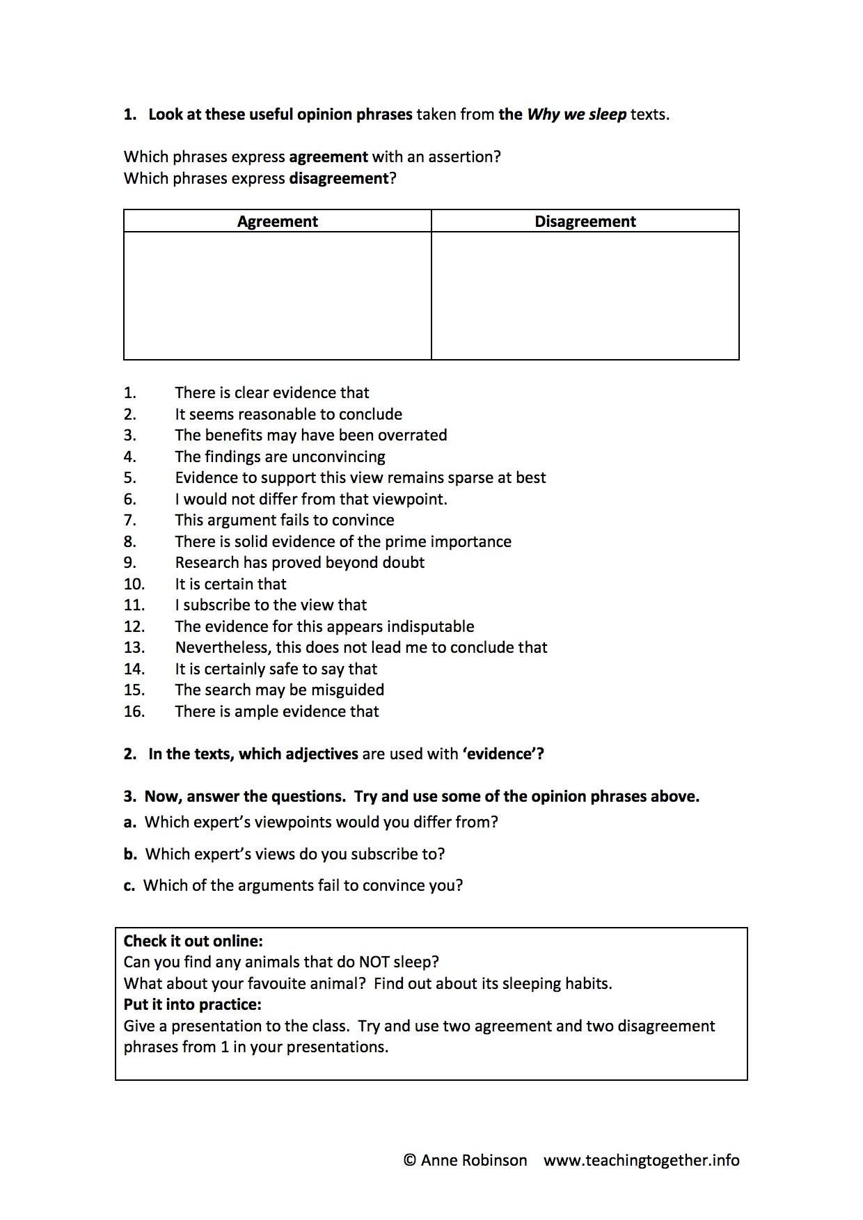 1. Look at these useful opinion phrases taken from the Why we sleep texts.