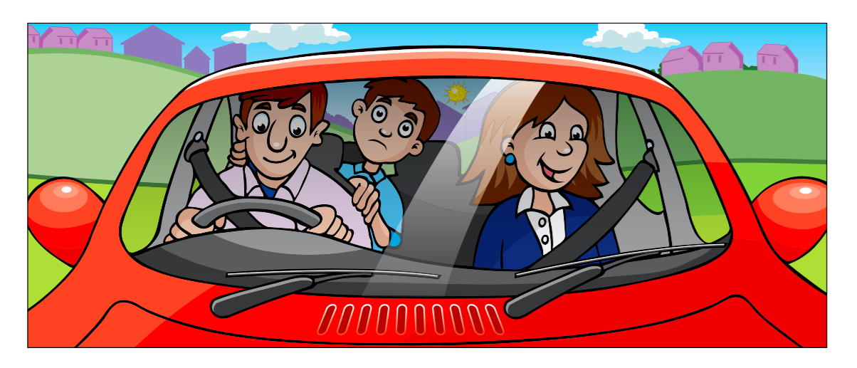 In this example, the story is about David and his parents. The picture shows them in their car, driving to their new house in another town, and David is looking out of the window and feeling unhappy.