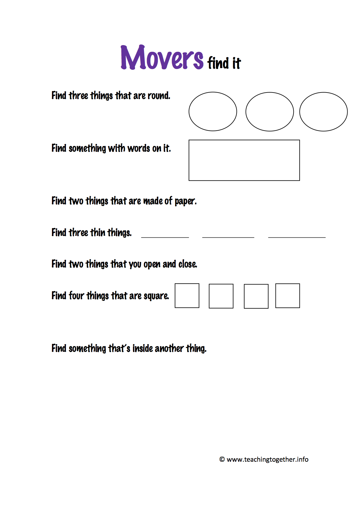 All the Movers Find it! challenges could be part of a class, with them being given 6-7 minutes to find as many of the things as possible.